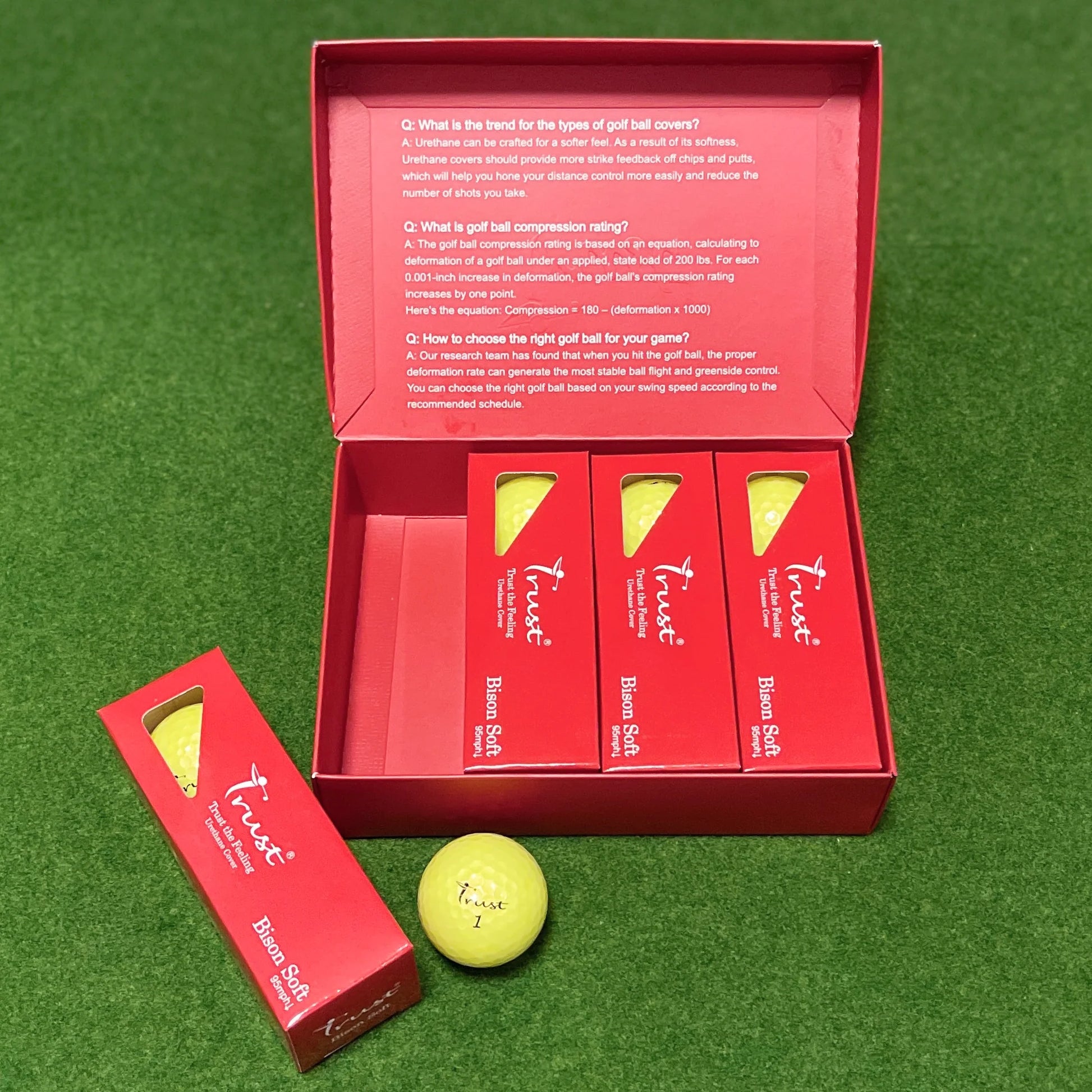 Trust Golf はウレタンカバーを採用し、ソフトな打感で耐久性のある優れたスピンコントロール性能を発揮させるとともに、飛距離との両面を実現するゴルフボールを開発しました。